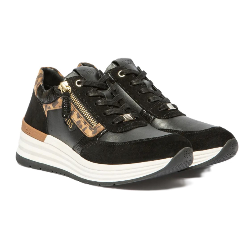 Cette basket basse signée TBS est tout simplement essentielle. On lui donne un bon point pour sa ligne dynamique appuyée par une tige en cuir et un coloris noir. Du cuir et textile pour la doublure et du synthétique pour sa semelle : voici ce qu'elle cache. On la retrouve ici féminisée par un talon de 5 cm. Le modèle incontournable du moment.